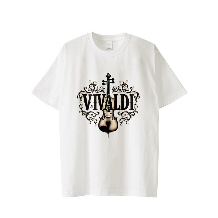 バロック音楽の巨匠アントニオ・ヴィヴァルディへのオマージュを込めた、洗練されたタイポグラフィックTシャツです。「四季」で知られる偉大な作曲家の名前を美しい文字デザインで表現し、音楽愛好家とファッション愛好家の両方に愛される一枚に仕上げました。
